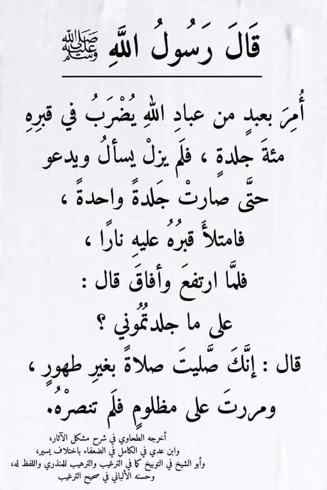 ▪️«أُمِرَ بعبد من عباد اللّٰه أن يُضرَب في قبره مائة جلدة، فلم يزل يسأل ويدعو حتى صارت جلدةً واحدةً، فجُلد جلدةً واحدةً، فامتلأ قبره عليه نارًا، فلما ارتفع عنه أفاق، قال: علام جلدتموني؟ فقيل له: